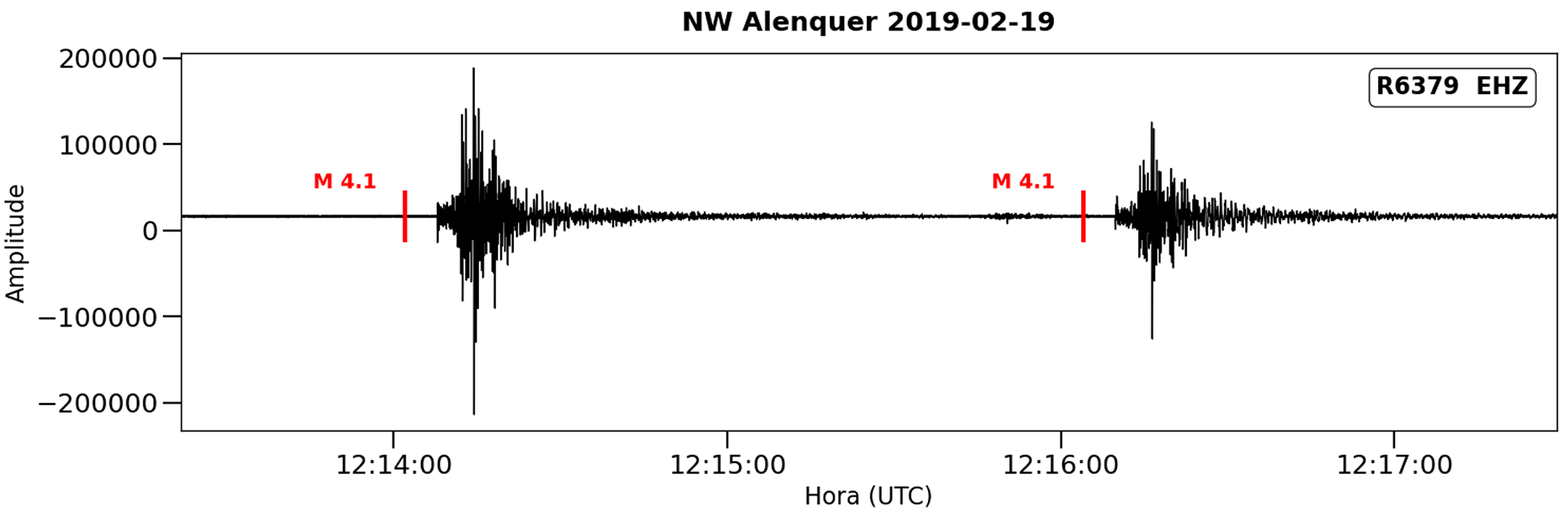 Nas ordenadas estão representadas amplitudes relativas. As linhas vermelhas assinalam a hora dos eventos (12:14:02 para o 1º e 12:16:04 para o 2º), tal como calculado pelo Instituto Português do Mar e da Atmosfera