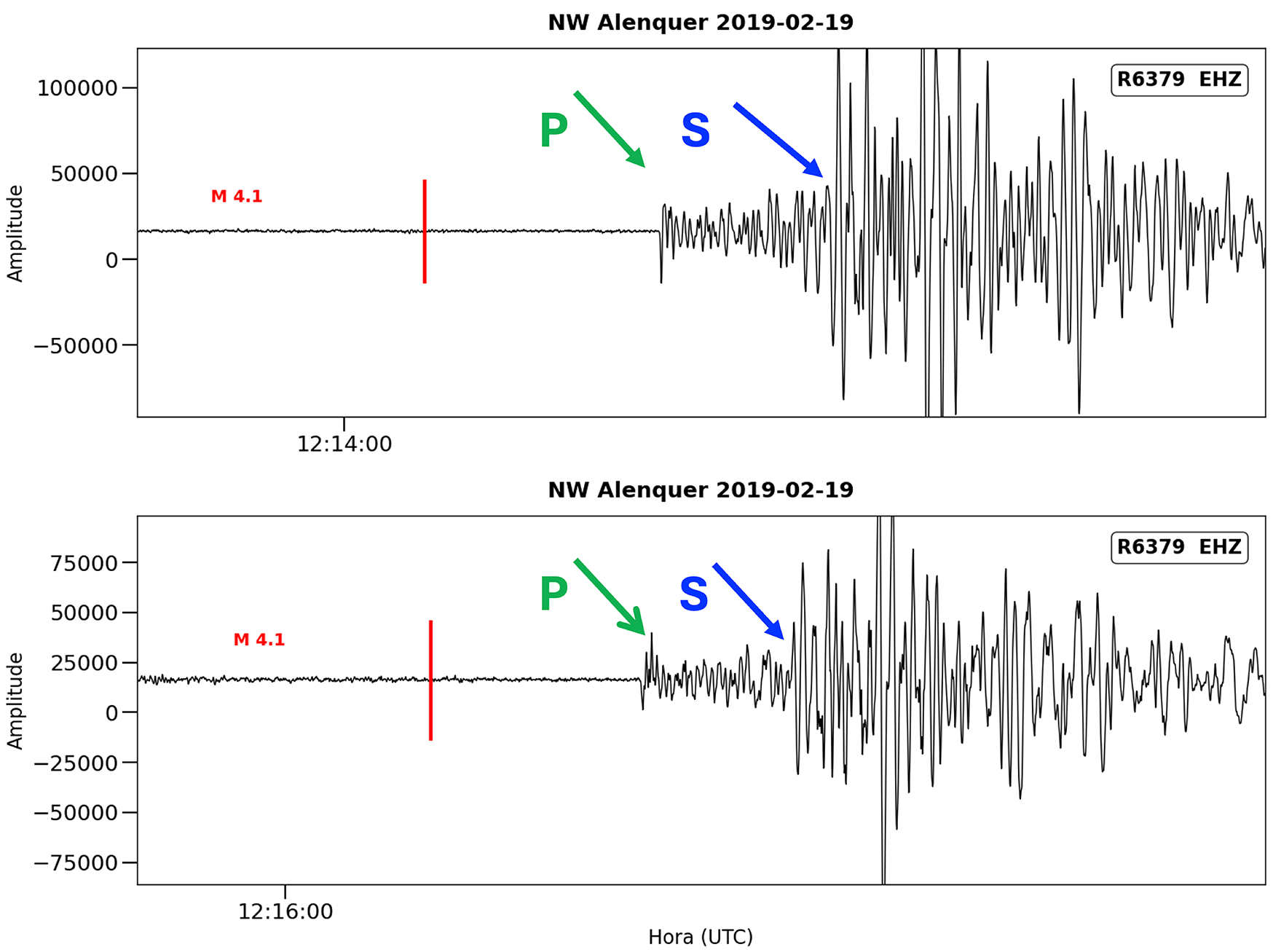 Nas ordenadas estão representadas amplitudes relativas. As linhas vermelhas assinalam a hora dos eventos (12:14:02 para o 1º e 12:16:04 para o 2º), tal como calculado pelo Instituto Português do Mar e da Atmosfera